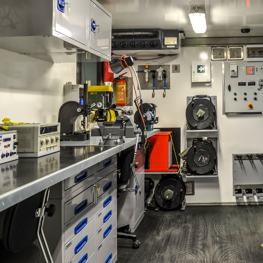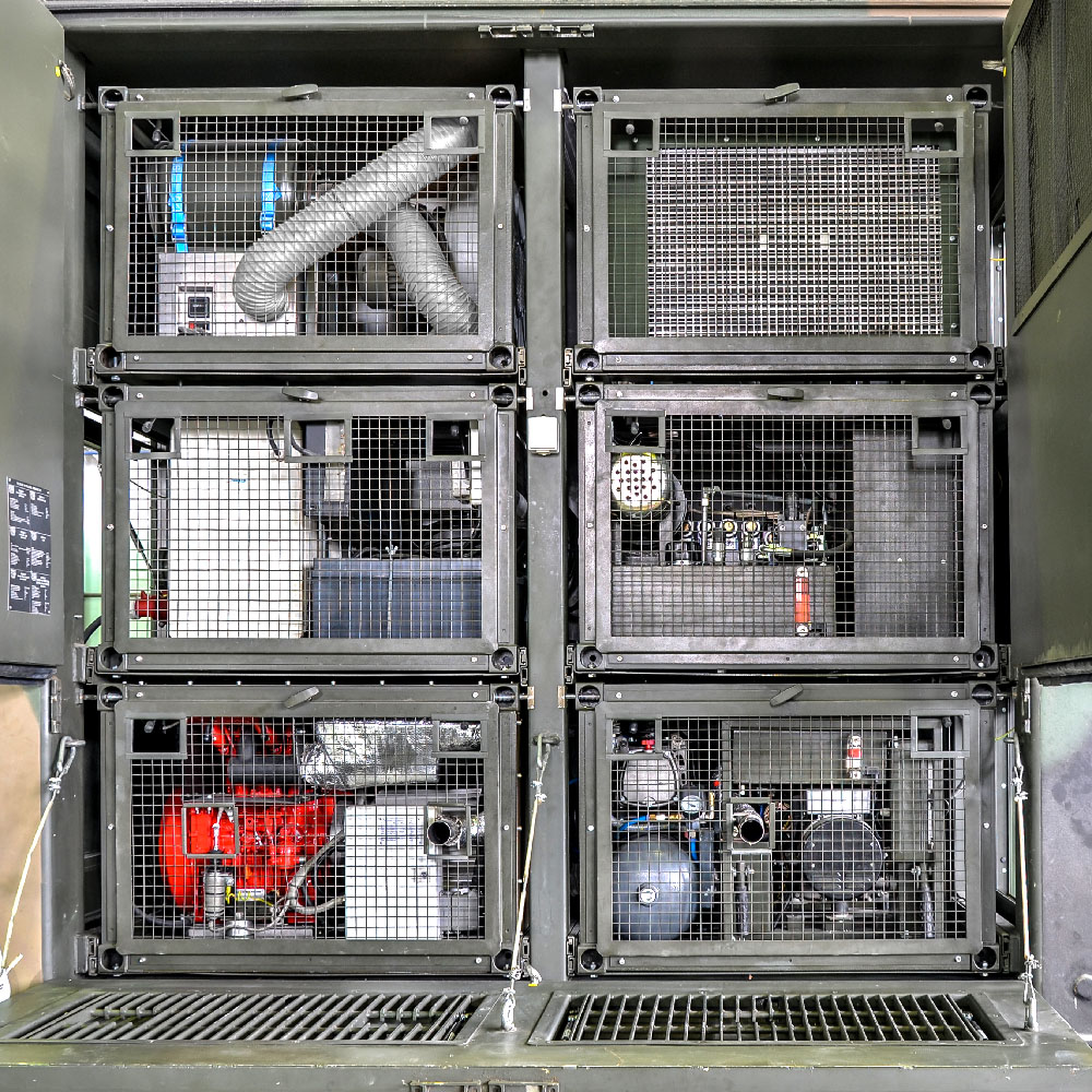 Kontener Artyleryjski Warsztat Remontu Uzbrojenia AWRU wyposażyliśmy w niezależne źródło zasilania. Zespół prądotwórczy o mocy 8 kW / 10 kVA umieściliśmy w przedziale technicznym.