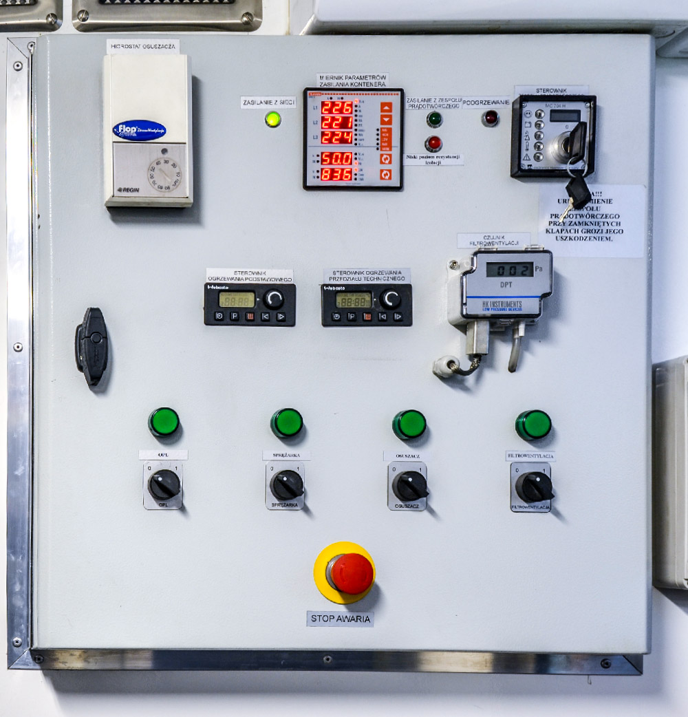 AWRU wyposażyliśmy w rozbudowaną instalację elektryczną, która pozwala na zasilanie wszystkich odbiorników wewnątrz kontenera. Szafa przyłączeniowa umieszczona na zewnętrznej ścianie kontenera pozwala na podłączenie do zasilania urządzeń zewnętrznych.